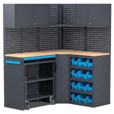 Dimensioni mm 2816x495x1900h 5 moduli ad angolo 12 contenitori e 1 carrello 2 pensili ad anta e angolare Fornito Smontato Prodotto non disponibileAvvisami appena torna disponibile -