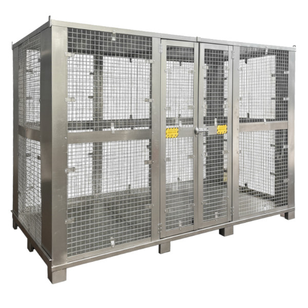 Armadio a rete per lo stoccaggio sicuro di bombole, realizzato in acciaio al carbonio con verniciature a polvere. Le sue dimensioni permettono di stoccare 78 bombole e, essendo munito di rampa, rappresenta una soluzione completa per il deposito temporaneo di bombole contenenti gas pericolosi, come il GPL. La struttura è dotata di una tettoia per proteggere dal sole e dalla pioggia. Grazie al materiale e alle tecniche di zincatura/verniciatura, l'armadio può essere utilizzato all'esterno nel pieno rispetto delle normative vigenti. Le ante sono predisposte per l'applicazione di un lucchetto o di un altro sistema di chiusura, al fine di impedire l'accesso a persone non autorizzate. Il bloccaggio interno delle bombole avviene attraverso catene e moschettone di sicurezza. Questo contenitore rispetta le normative dettate dal D.Lgs. 81/08 inerenti lo stoccaggio del gas, oltre alle integrazioni del comune di riferimento e alle regolamentazioni dei vigili del fuoco, che si occupano di verificarne la messa in sicurezza. Il design del prodotto favorisce l'areazione e mantiene le bombole protette da urti. Ogni armadio viene fornito con etichettatura di identificazione e sicurezza. Per ulteriori informazioni tecniche e soluzioni certificate è possibile consultare la pagina dedicata agli armadi bombole gas.