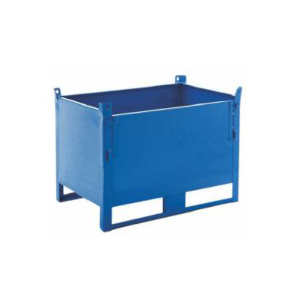 Contenitore di acciaio al carbonio verniciato con smalto RAL 5015. Particolarmente adatti allo stoccaggio e alla movimentazione di particolari pesanti solidi. Presenti alla base 2 traverse per garantire lo stoccaggio su scaffalature. Possibilità di sovrapporre piu’ unità fra di loro.