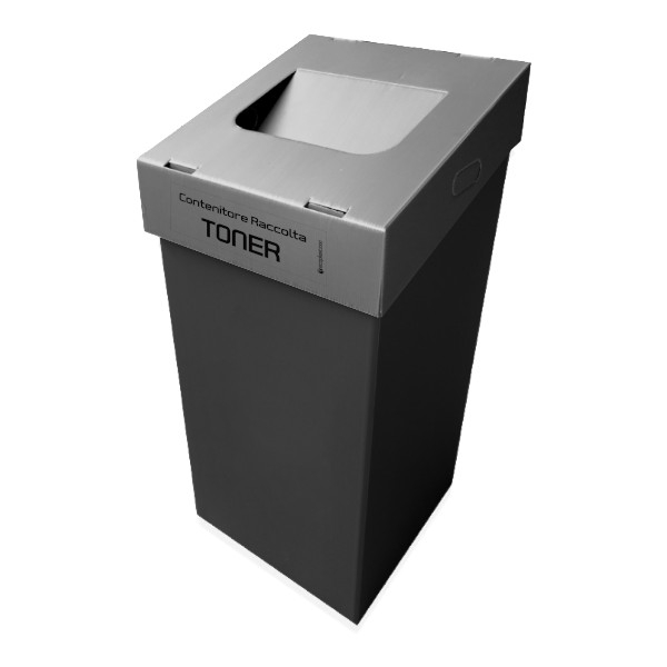 Contenitore per la per la raccolta di Toner. Parallelepipedo in Polipropilene alveolare spessore 2,5 mm; Coperchio colorato e fondo nero con chiusura a scatto auto-montante; coperchio con funzionalità di ferma sacco munito di bocchetta centrale a cerniera per introduzione rifiuto; 2 manici ottenuti in fase di fustellatura e posizionati ai lati del contenitore per facilitare lo svuotamento da parte dell'operatore. E' consigliato l'utilizzo di doppio (o triplo) sacco in PE all'interno. Fornito completo di stampa rifiuto. Le caratteristiche del prodotto lo rendono particolarmente adatto nel campo del deposito temporaneo rifiuti.