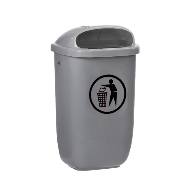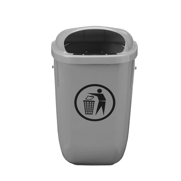 Gettacarte pensile di colore grigio con una capienza di 50 lt realizzati in PP Polipropilene di prima scelta garantito e certificato; materiale totalmente riciclabile, resistente ai raggi U.V. e infrarossi, alle alte e basse temperature. Dotato di predisposizioni che ne permettono il fissaggio su parete e o su palo richiedibile, come accessorio, in acciaio zincato ø 60 mm 1200h mm dotato di supporto in acciaio a doppia cerniera che permette l'apertura del coperchio ed agevola la movimentazione del cestino. Disponibile nel colore Grigio o Verde. Dotato di una piastra in acciaio inox per lo spegnimento delle sigarette e di foratura sul fondo per permettere agevolmente il drenaggio di liquidi compresa la pioggia. La chiusura è dotata di serratura con chiave triangolare in plastica fornita. Lo svuotamento è manuale mediante sganciamento del cesto. Come standard viene fornito con piastra per il fissaggio a parete ma è possibile richiedere come optional il palo con piastra di fissaggio.