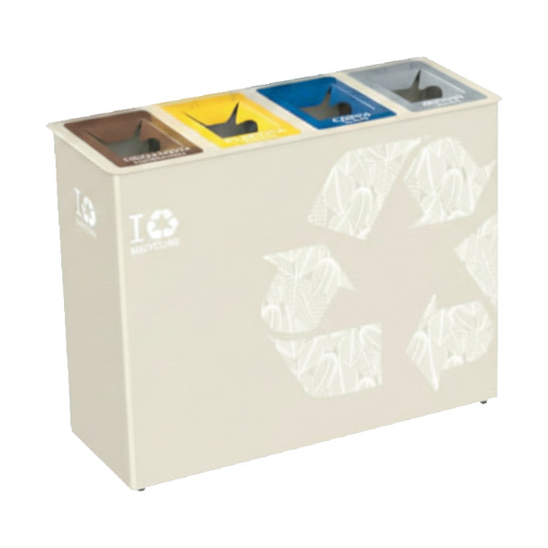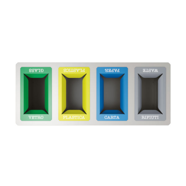 Mobile gettacrte capienza 200 Litri, compatto da interno, in un unica soluzione sono presenti 4 aperture per il conferimento dei rifiuti, suddiviso in 4 bocche con colori differenti preserigrafate con scritte tipologia rifiuto in due lingue e separatori interni in lamiera zincata. Un unico portello superiore permette il prelevamento dei sacchi interni facilitato anche dal braccio idraulico che trattiene lo stesso aperto e ne permette un agevole chiusura in sicurezza. Verniciatura a polvere di colore grigio. i colori identificativi delle bocche di carico sono 6: verde, giallo, grigio scuro, blu, celeste, marrone.
