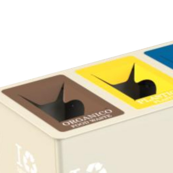 Mobile gettacrte compatto alta capienza da interno, in un unica soluzione sono presenti 4 aperture per il conferimento dei rifiuti, suddiviso in 4 bocche con colori differenti preserigrafate con scritte tipologia rifiuto in due lingue e separatori interni in lamiera zincata. Un unico portello superiore permette il prelevamento dei sacchi interni facilitato anche dal braccio idraulico che trattiene lo stesso aperto e ne permette un agevole chiusura in sicurezza. Verniciatura a polvere di colore grigio. i colori identificativi delle bocche di carico sono 7: verde, giallo, grigio scuro, blu, celeste, marrone.