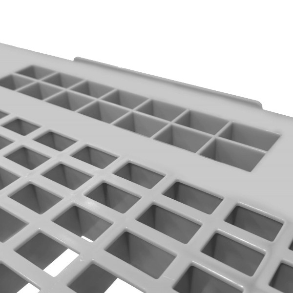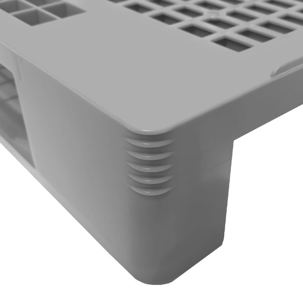 Le tre traverse di cui è provvisto gli permettono una comoda inforcabilità da tutti e quattro i lati e garantiscono robustezza e resistenza alla flessione anche sotto carichi importanti. La superficie superiore grigliata consente il drenaggio dei liquidi e i piccoli bordi perimetrali di cui è munito aiutano lo stoccaggio della merce, fornendo un appiglio che evita o comunque riduce notevolmente lo slittamento in fase di carico/scarico con transpallet elettrici, zanzarini, transpallet manuali e/o muletti.