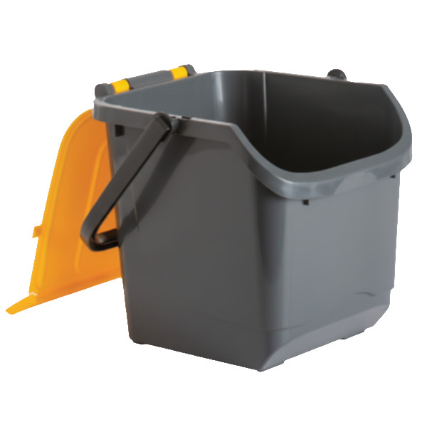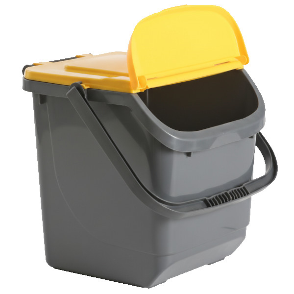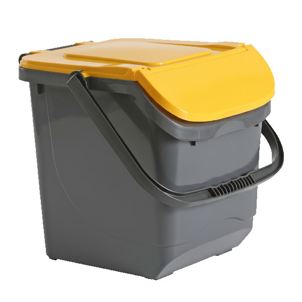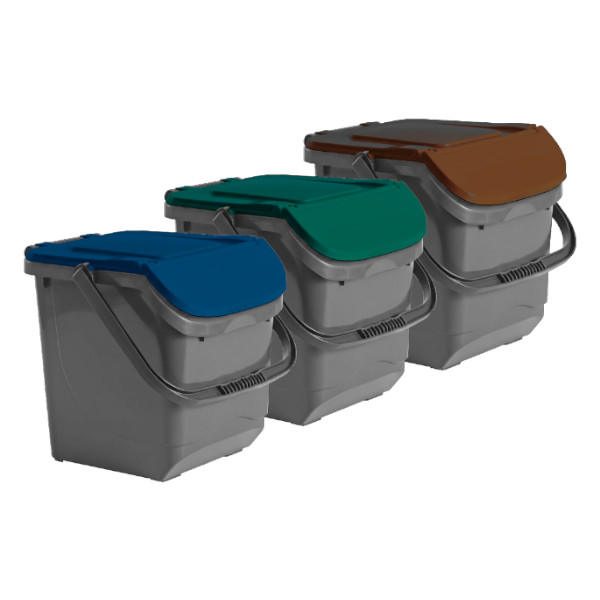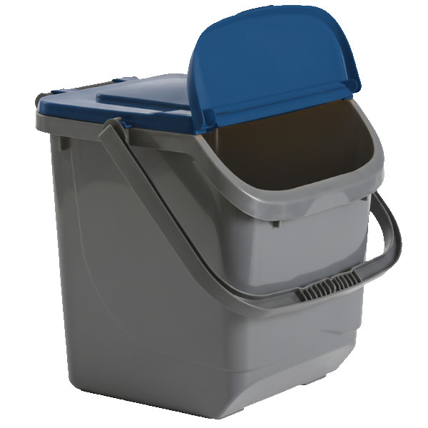 Pattumiera impilabile in polipropilene con struttura portante di colore grigio e coperchio disponibile in quattro colori, per facilitare la differenziazione dei rifiuti. Il coperchio, dotato di doppia apertura per l'inserimento e lo svuotamento, permette l'impilabilità e, grazie a un comodo manico, si blocca per prevenire aperture accidentali causate da urti o animali. Con una capienza di 33 litri, è una pattumiera pratica e funzionale.