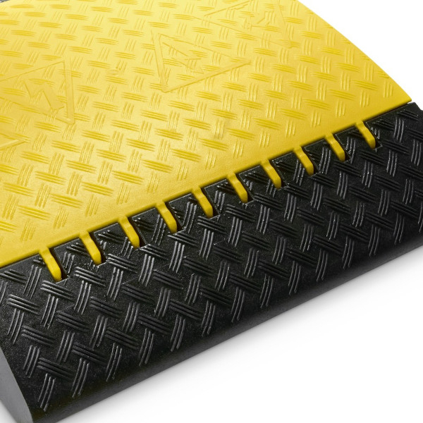 Pedana passacavo con 5 canali suddivisi in 2 canali 59 x 61 mm, 2 da 65 x 62 mm, 1 da 63 x 60 mm. Costruito in TPU (poliuretano termoplastico) e con coperchio incernierato. Rivestimento anti-scivolo, nuovi connettori, fori di fissaggio. Rampe laterali per l'attraversamento anche su piccole ruote, passeggini e sedie a rotelle. Superficie inferiore realizzata per ottenere massima aderenza al suolo. Modulazione per installazione semplificata e fissaggio rapido. Spesso richiesto per completare kit di contenimento e trasporto attrezzature audio, video, eventi, spettacoli. Proprietà ignifufughe, di isolamento elettrico e di resistenza ad acidi e solventi. Resistente alla corrosione e ai prodotti chimici, all'abrasione e agli urti. Non assorbe acqua o liquidi. Proprietà di antiaderenza. Stabilità dimensionale. La sua struttura permette una carrabilità di 30000 kg ( 30 ton ).