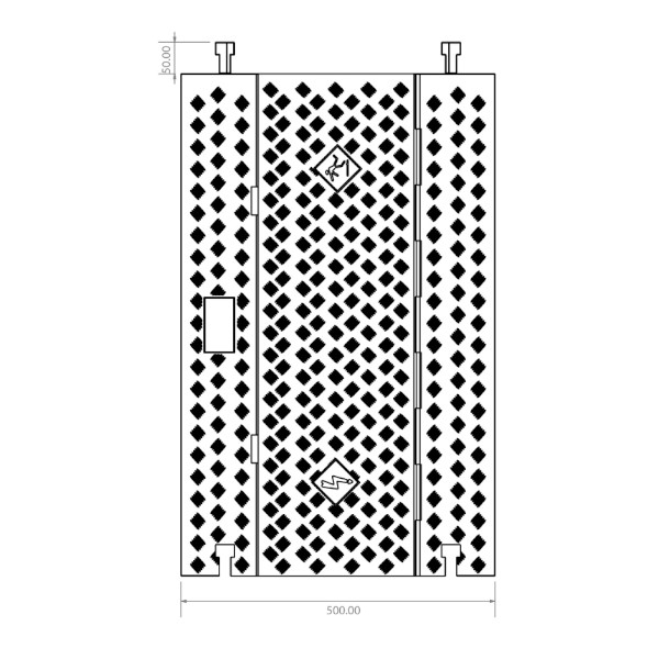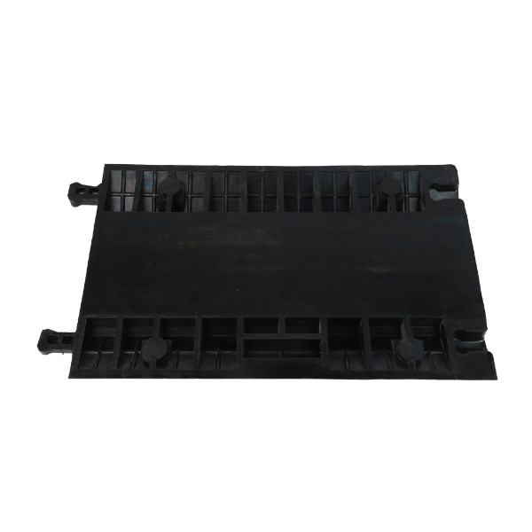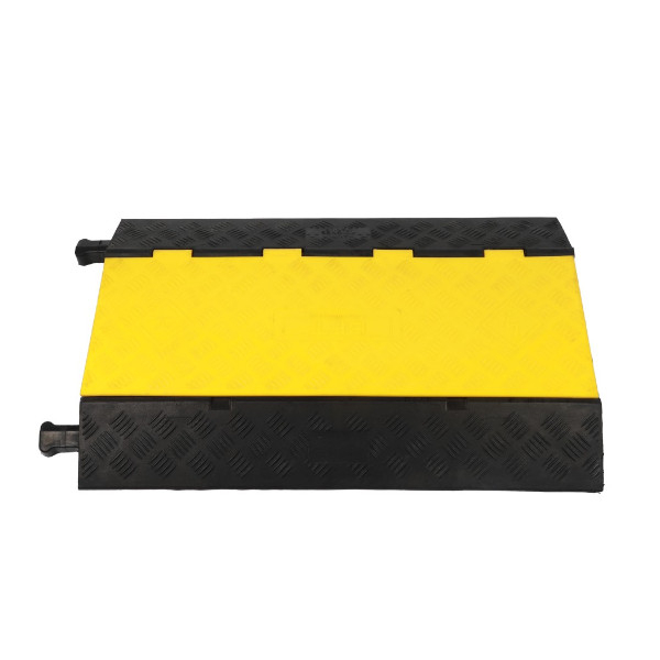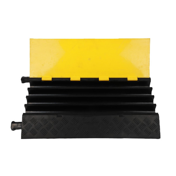 Pedana passacavo 4 canali 50 x 50 mm, base costruita in gomma rinforzata con coperchio. Rivestimento anti-scivolo. Rampe laterali con lieve pendenza per l'attraversamento anche su piccole ruote, passeggini e sedie a rotelle. Superficie inferiore realizzata per ottenere massima aderenza al suolo. Modulazione a resistente e con installazione semplificata e fissaggio rapido. Spesso richiesto per completare kit di contenimento e trasporto attrezzature audio, video, eventi, spettacoli. Proprietà ignifughe, di isolamento elettrico e di resistenza ad acidi e solventi. Resistente alla corrosione e ai prodotti chimici, all'abrasione e agli urti. Non assorbe acqua o liquidi. Proprietà di antiaderenza. Stabilità dimensionale. Portata approssimativa di 30 tonnellate. Prodotto che entrerà a far parte del circuito ecosostenibile in quanto realizzato per circa il 100% di materiale riciclabile.