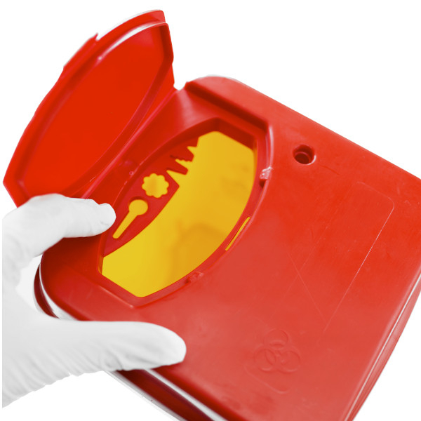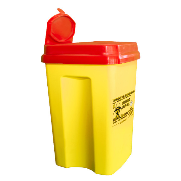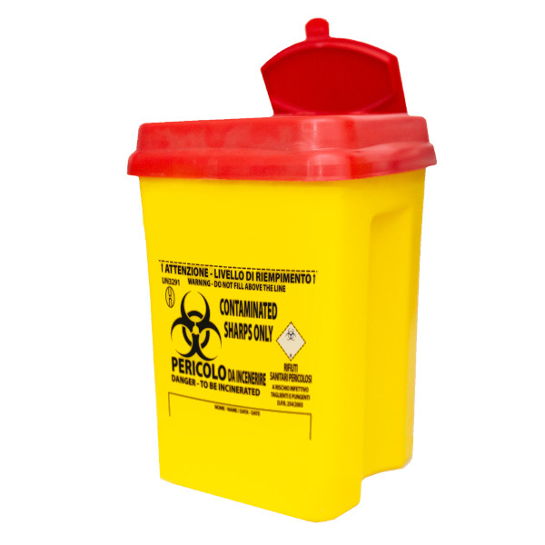 Contenitore troncopiramidale da 5 litri, monouso utile al contenimento per l'eliminazione di oggetti taglienti, pungenti, affilati, aghi e siringhe. Ambiti di utilizzo Ospedali, Cliniche, Laboratori, Casa di Cura, ecc.. Corpo e coperchio con chiusura temporanea a scatto definitiva. Alta resistenza agli urti e alla perforazione. Maneggevioli nell'uso, impilabili per favorire il trasporto allo smaltimento. Tenuta ermetica anche con contenitore in posizione capovolta. etichetta descritittiva uso e smaltimento.