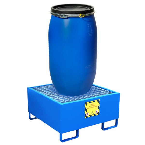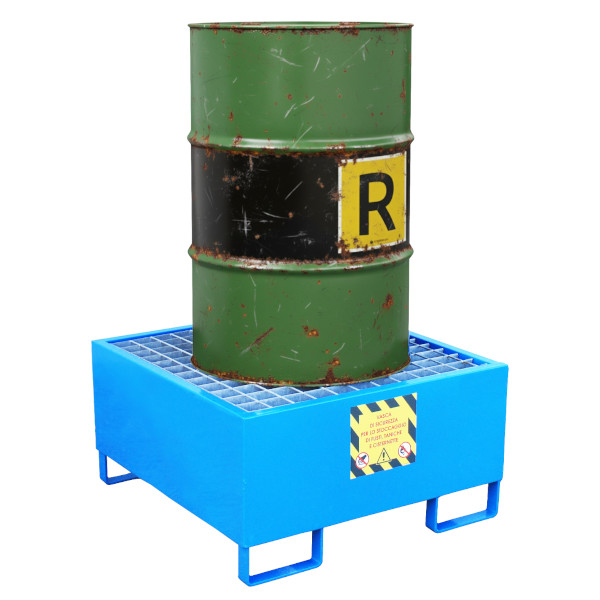 Vasca di contenimento in acciaio al carbonio con trattamento esterno anticorrosione per la raccolta di sversamenti in appoggio su 4 piedi forcabili. La vasca di contenimento realizzata in acciaio al carbonio, allestita con rinforzi strutturali. Saldatura a controllo elettronico, trattamento anticorrosione e successiva finitura con smalto blu Ral 5015. Il Grigliato è realizzato in acciaio al carbonio zincato con maglie ad alta portata. Dotato di etichettatura di sicurezza anti infortunio come previsto dalle normative vigenti. Prodotto immatricolato e verificato in collaudo in conformità CE.