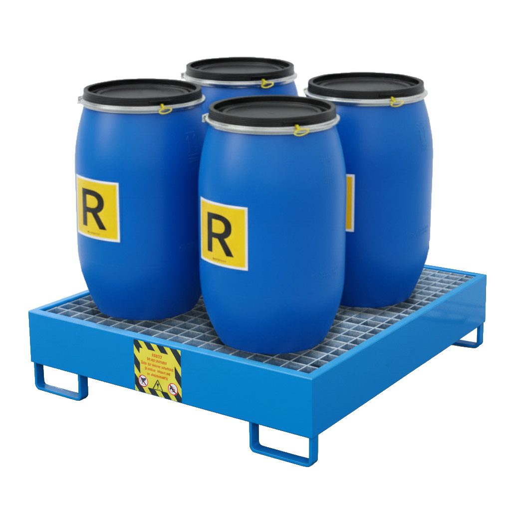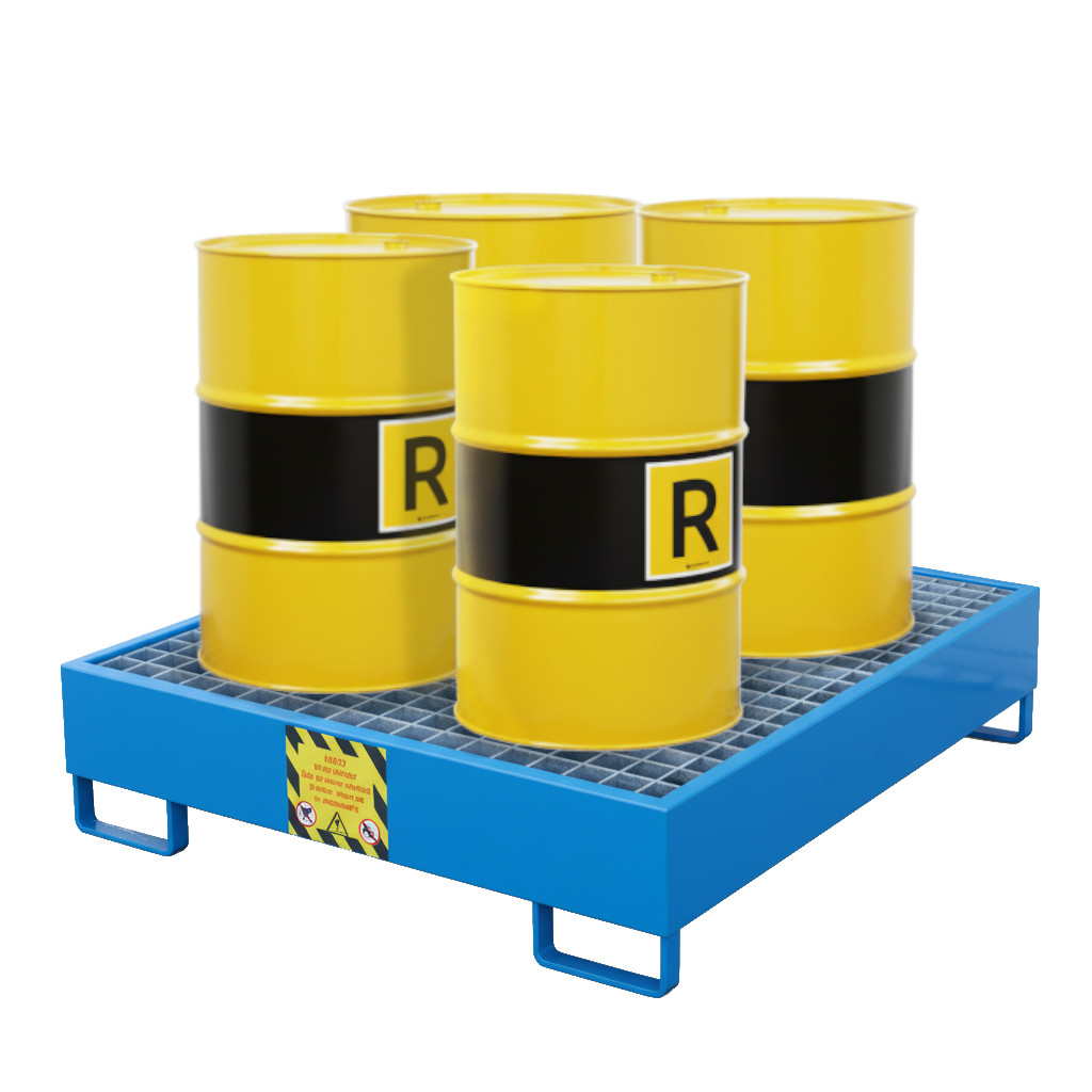 Vasca di contenimento da 330 litri con griglia, per lo stoccaggio e la messa in sicurezza di fusti. Struttura realizzata in lamiera di acciaio con 4 piedi, di rialzo e appoggio, per agevolare la movimentazione a vuoto con trans pallet o muletto a forche; predisposizione per il montaggio modulare di più di vasche.Trattamento superficie con vernice a polvere; griglia in acciaio zincato, asportabile per la agevolare la manutenzione e la pulizia. Idonea al contatto con fluidi compatibili chimicamente con l'acciaio. Conforme a D.Lgs n° 152/06 del 03/04/2006 a tutela dell' ambiente, del suolo e sottosuolo, dell' acqua e messa in sicurezza di situazioni a rischio; D.P.R. 915 del 10.09.192 e successive modifiche. Realizzate per la messa in sicurezza di 4 fusti da 220 litri e taniche.