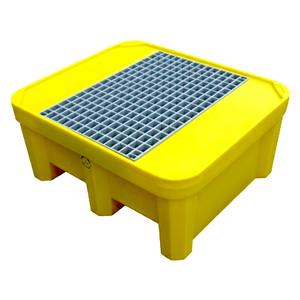 Vasca di contenimento con griglia con capienza di 225 litri, per lo stoccaggio e la messa in sicurezza di fusti taniche. Vasca in polietilene atossico stabilizzato U.V. di colore giallo roto-stampato, monolitico ovvero stampato in unico pezzo senza giunzioni. Struttura auto portante e rinforzata per resistere agli urti, resistente agli agenti chimici. Dotata di griglia in Polirpopilene asportabile per una facile pulizia; sormontabile a vuoto. Movimentazione con muletto e trans-pallets a vuoto.