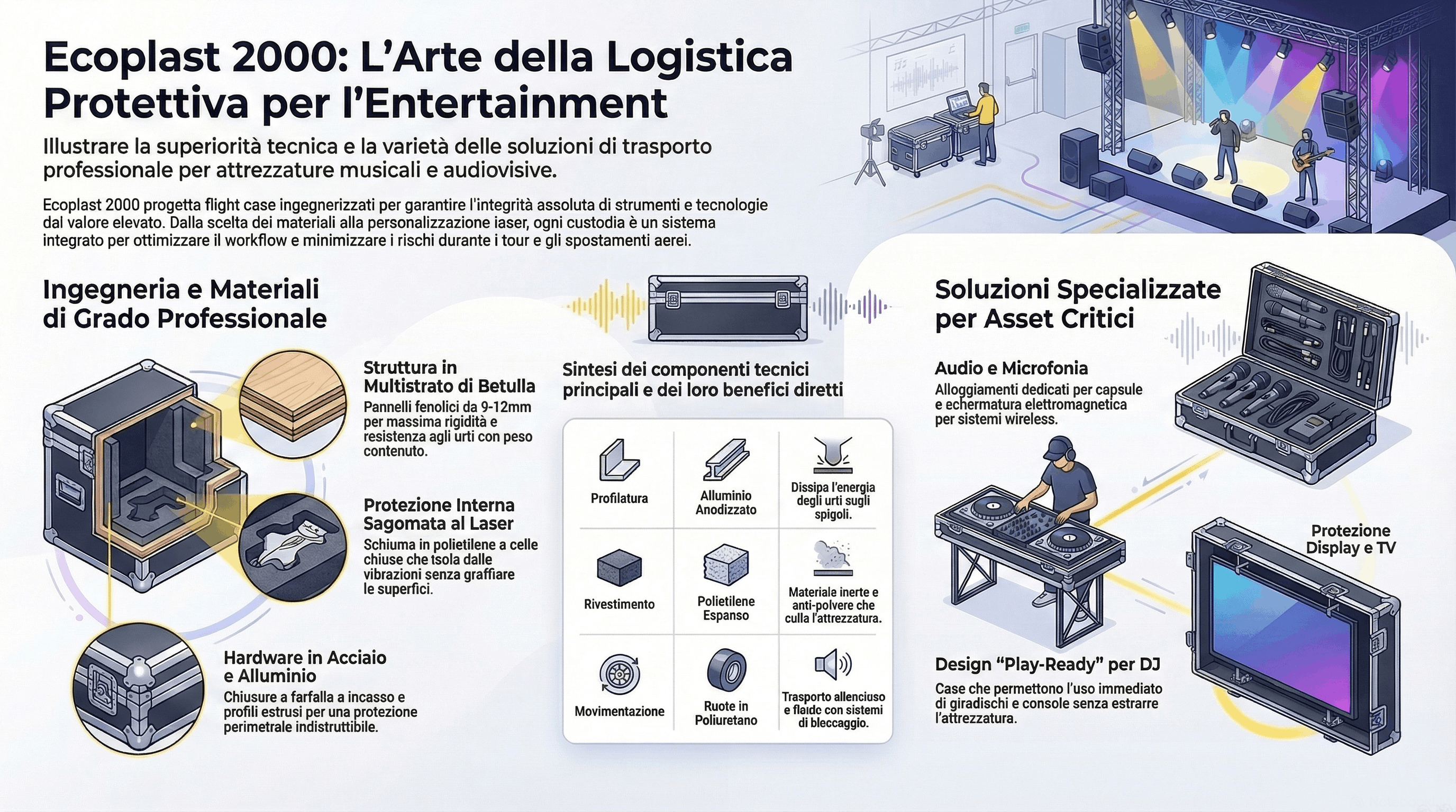 Nel settore del live entertainment, della produzione musicale e dei servizi audiovisivi professionali, la movimentazione degli asset rappresenta una fase critica. Ecoplast 2000, con la sua consolidata esperienza nel campo della logistica protettiva, mette a disposizione una gamma specializzata di flight case per microfoni, flight case per aste microfoniche, flight case per vinili, flight case per giradischi, flight case per console DJ, flight case per chitarra, flight case per pedaliera, flight case per TV e flight case per tastiera.