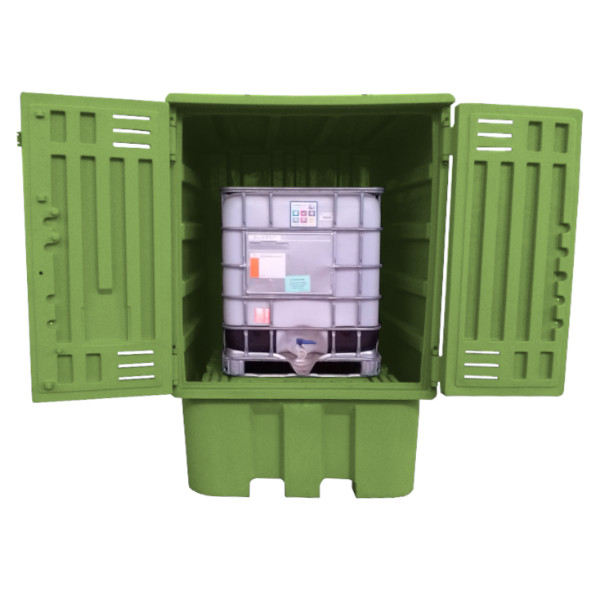 Box con vasca di raccolta monoblocco in polietilene per l'utilizzo in sicurezza di cisternette da 1000 litri con liquidi pericolosi, per uno stoccaggio e uno spillaggio sicuri e per impedire che sversamenti inquinino il sistema delle acque. Realizzato con stampaggio rotazionale in polietilene rigenerato, il box e la vasca sono monoblocco e senza saldature. La capacità di raccolta della vasca è di 1070 litri. Sono presenti 4 griglie di aerazione e cardini stampati nelle ante, una chiusura a leva lucchettabile e maniglie (su richiesta è possibile avere una chiusura a leva con serratura). È possibile anche l'ancoraggio antivento (golfari inox opzionali) e un porta documenti interno sul lato sinistro. Le caratteristiche del prodotto lo rendono particolarmente adatto per il deposito temporaneo di rifiuti. È solido, resistente, facile da pulire e non richiede manutenzione; è inoltre resistente ad acidi, basi e oli.