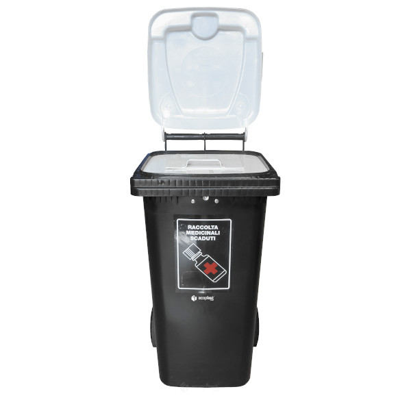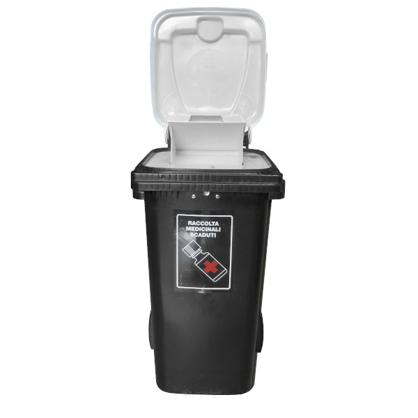 Vasca e coperchio stampati ad iniezione e realizzati in polietilene alta densita' (HDPE) di prima fusione, garantito e certificato. Attacco a pettine ricavato per fusione sul bordo anteriore della vasca, assenza di bordi taglienti e spigoli vivi. Ruote a naso in gomma piena D. 200 mm. e assale in acciaio zincato elettroliticamente. Appositamente progettato per la raccolta dei medicinali scaduti nel rispetto delle norme antinfortunistiche. Dotato di un ripiano in ABS con apposito cassetto tronco piramidale basculante che non consente nessun tipo di contatto con l'interno del contenitore stesso. Dimensioni bocca cassetto mm 240x160. Materiale totalmente riciclabile, resistente ai raggi U.V. e infrarossi, agli acidi e alcali, alle alte e basse temperature. Maniglie posteriori per ottimizzare la movimentazione ottenute in fase di stampaggio. Certificazione conforme alle normative vigenti. Coperchio con serratura con chiave triangolare. Personalizzazioni su richiesta : marchiatura a caldo; marchiatura a rilievo su corpo e coperchio, incisioni numeriche.