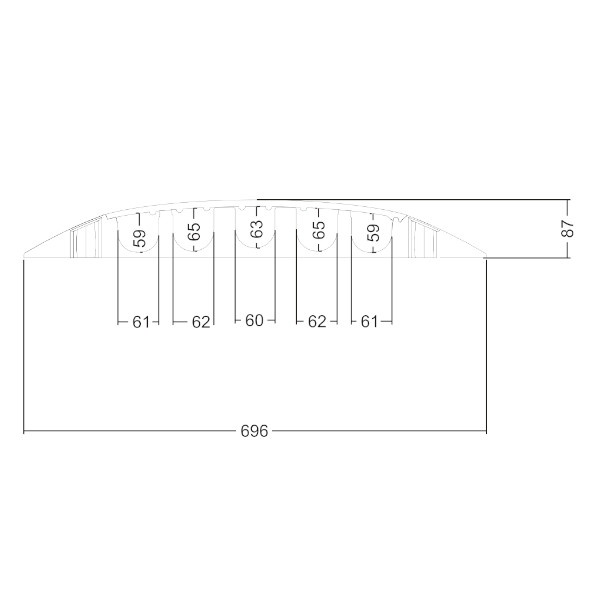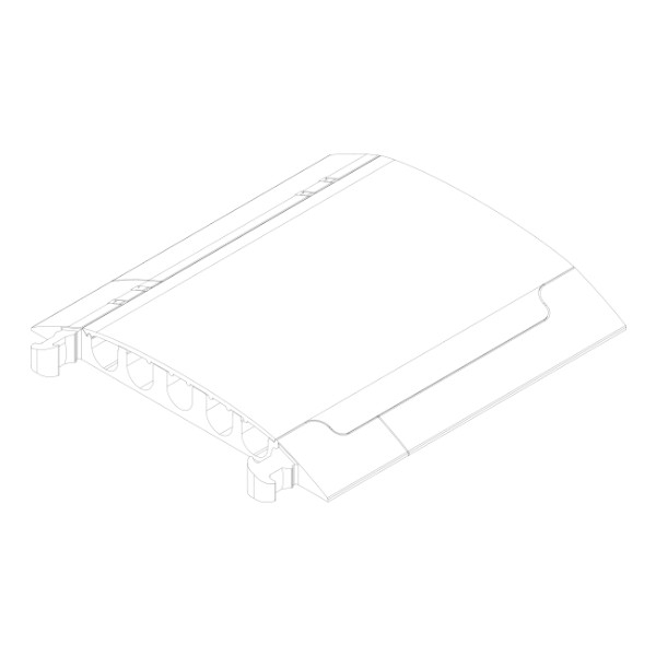 Pedana passacavo con 5 canali suddivisi in 2 canali 59 x 61 mm, 2 da 65 x 62 mm, 1 da 63 x 60 mm. Costruito in TPU (poliuretano termoplastico) e con coperchio incernierato. Rivestimento anti-scivolo, nuovi connettori, fori di fissaggio. Rampe laterali per l'attraversamento anche su piccole ruote, passeggini e sedie a rotelle. Superficie inferiore realizzata per ottenere massima aderenza al suolo. Modulazione per installazione semplificata e fissaggio rapido. Spesso richiesto per completare kit di contenimento e trasporto attrezzature audio, video, eventi, spettacoli. Proprietà ignifufughe, di isolamento elettrico e di resistenza ad acidi e solventi. Resistente alla corrosione e ai prodotti chimici, all'abrasione e agli urti. Non assorbe acqua o liquidi. Proprietà di antiaderenza. Stabilità dimensionale. La sua struttura permette una carrabilità di 30000 kg ( 30 ton ).