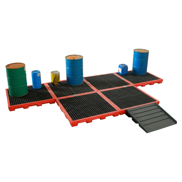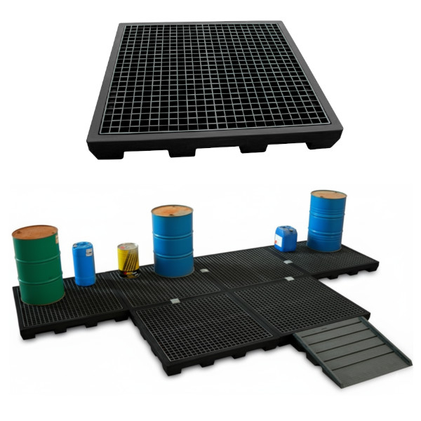 Vasca di contenimento modulare per la realizzazione di pavimenti con vasca di raccolta in polietilene per un uso in sicurezza di fusti e stoccaggio liquidi inquinanti. Evitano che i liquidi sversati finiscano ad inquinare il sistema di raccolta dell'acqua. Realizzata in rotazionale con polietilene vergine colore arancio un pezzo unico senza saldature e griglia asportabile in PE di colore nero con dimensioni mm 1200 x 1200. Ottima resistenza alla maggior parte degli acidi, delle basi e degli oli. Resistenti, leggere, estremamente versatili. Realizzata con il 30% di materiale riciclato.