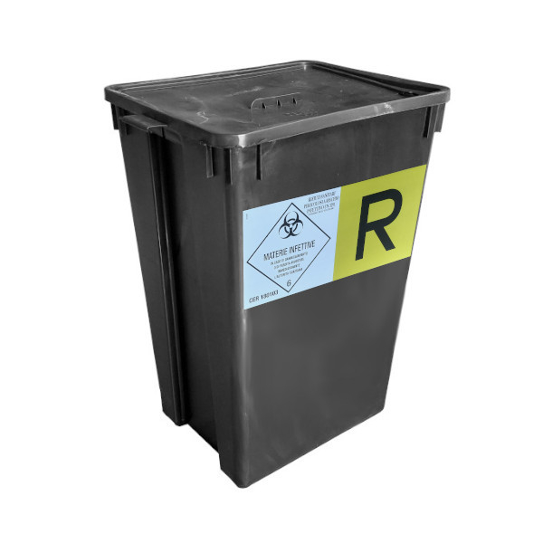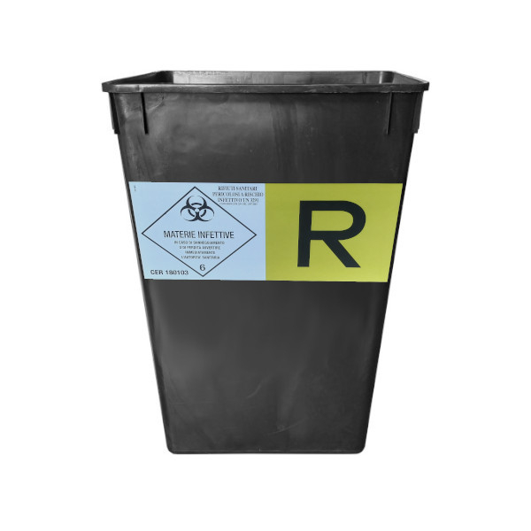 Contenitore troncopiramidale RSP da 50 lt con etichetta, nero, stampato in PP COP - Polipropilene copolimero, dotato dell'etichetta riportante la specifica del conferimento, con chiusura ermetica a scatto grazie al particolare profilo del bordo e le alette di bloccaggio. Coperchio amovibile dotato di maniglia superiore, fusto dotato di due maniglie incavate, ricavate mediante opportuna sagomatura delle superfici laterali. La chiusura del sacco interno deve essere a ciuffo con serraggio fascetta o nastro adesivo all'estremità. La resistenza, la non porosità e le altre particolari proprietà del materiale impiegato rendono questi contenitori compatibili con la sanificazione e con l'impiego in ambito ospedaliero. Attraverso l'utilizzo di prodotti disinfettanti e di apposite procedure di sterilizzazione, è possibile abbattere la carica microbica potenzialmente presente sulle superfici dei contenitori dopo l'uso, senza in alcun modo intaccarne la struttura. Dimensioni esterne superiori mm 339x405; altezza con coperchio mm 495; spessore pareti mm 1,6; peso complessivo del contenitore Kg 1,306 (+/-3%); massa lorda massima Kg 6. Contenitore omologato per il trasporto di rsp solidi, fa parte dei gruppi di imballaggio II e III, con massa lorda massima 6 kg, Il Coperchio ha una marchiatura CSI/DK01. Possibilità di inserire appositi sacchi omologati per rifiuti sanitari pericolosi. Omologato per stoccaggio e trasporto a terra e via mare. Le caratteristiche del prodotto lo rendono particolarmente adatto nel campo del deposito temporaneo rifiuti. Prodotto ecosostenibile in quanto realizzato per circa il 100% da materiale riciclato e per circa il 100% di materiale riciclabile.