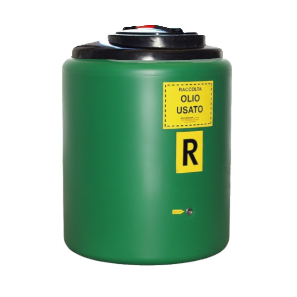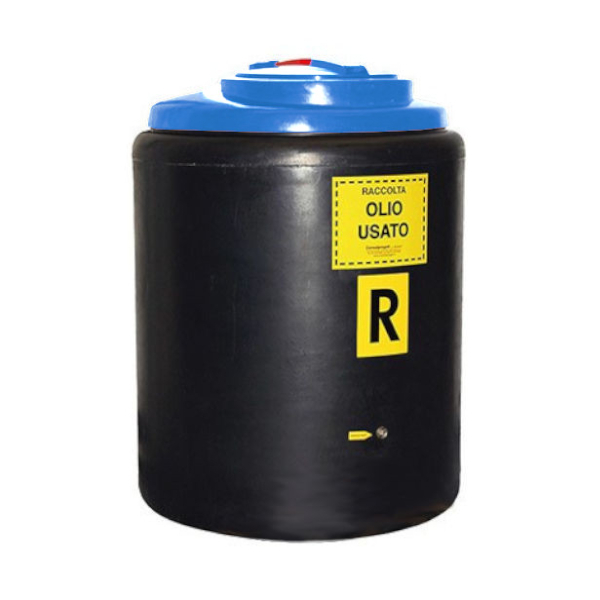 Contenitore in polietilene HD per lo stoccaggio degli oli lubrificanti esausti. Forma cilindrica ad asse verticale, fondo piano, serbatoio doppia parete in polietilene antiacido antiurto, stampaggio monofusione con procedimento rotazionale centrifugo senza saldature, doppio serbatoio di sicurezza inglobato uno all'interno dell'altro. Trattamento per resistenza ai raggi U.V.