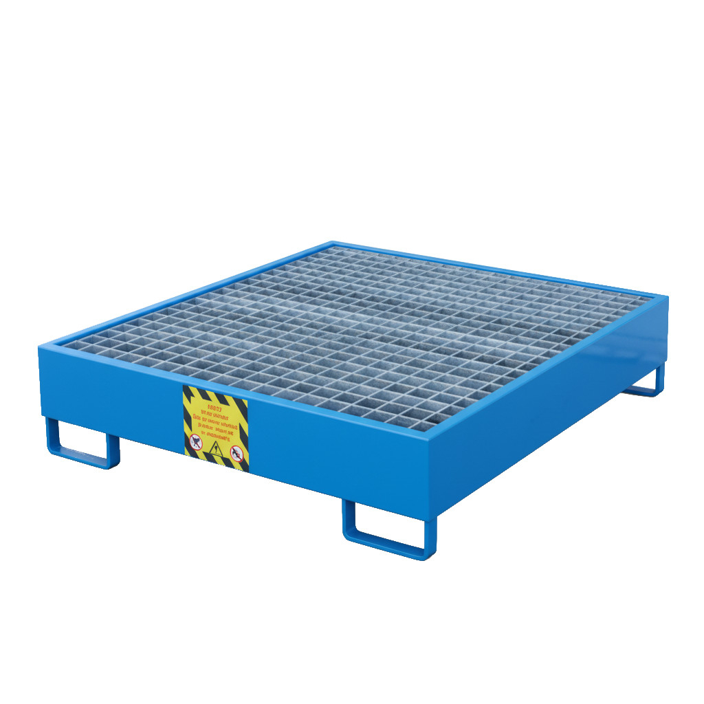 Vasca di contenimento da 330 litri con griglia, per lo stoccaggio e la messa in sicurezza di fusti. Struttura realizzata in lamiera di acciaio con 4 piedi, di rialzo e appoggio, per agevolare la movimentazione a vuoto con trans pallet o muletto a forche; predisposizione per il montaggio modulare di più di vasche.Trattamento superficie con vernice a polvere; griglia in acciaio zincato, asportabile per la agevolare la manutenzione e la pulizia. Idonea al contatto con fluidi compatibili chimicamente con l'acciaio. Conforme a D.Lgs n° 152/06 del 03/04/2006 a tutela dell' ambiente, del suolo e sottosuolo, dell' acqua e messa in sicurezza di situazioni a rischio; D.P.R. 915 del 10.09.192 e successive modifiche. Realizzate per la messa in sicurezza di 4 fusti da 220 litri e taniche.