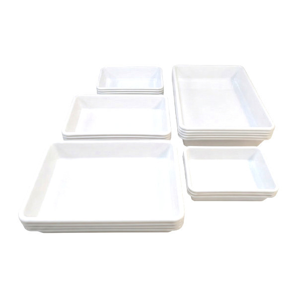 Vaschetta rettangolare colorata con dimensioni 490x335x80h mm, inseribile, stampata ad iniezione in HDPE - polietilene ad alta densità, bianca ma disponibile anche in vari colori (vedi foto). Adatta all'utilizzo nel settore alimentare e con elevata capacità di carico.