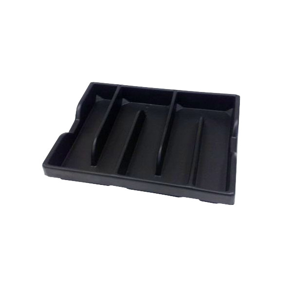 Vaschetta portaposate termoformata in materiale PST ( polistirolo compatto ) per lo stoccaggio di circa 100 posate, unico stampo composto da 5 vani che contengono circa 20 posate cad. Il materiale PST garantisce eccellenti prestazioni di resistenza all' impatto a bassa temperatura e risulta idoneo al contatto con gli alimenti.